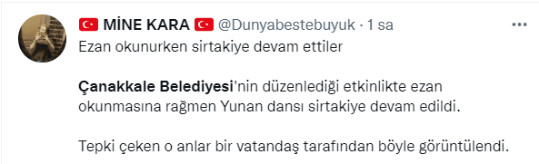 CHP'li Çanakkale Belediyesi'nin bir etkinliğinde Yunan dansı sirtaki yapılırken, ezan okunmasına rağmen dansın kesilmemesi tepki ile karşılandı.