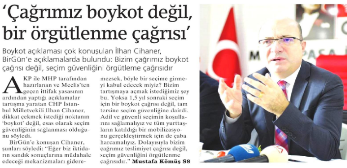 16 Mart'ta Gazeteduvar'a konuşan CHP'li İlhan Cihaner, seçim boykotunu başlatmak gerektiğini ima etmişti. 18 Mart'ta Birgün'ün yayınladığı habere göreyse Cihaner, boykot çağrısı yapmadığını söyledi.