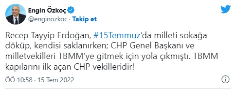 "Recep Tayyip Erdoğan, 15Temmuz’da milleti sokağa döküp, kendisi saklanırken; CHP Genel Başkanı ve milletvekilleri TBMM’ye gitmek için yola çıkmıştı. TBMM kapılarını ilk açan CHP vekilleridir!"