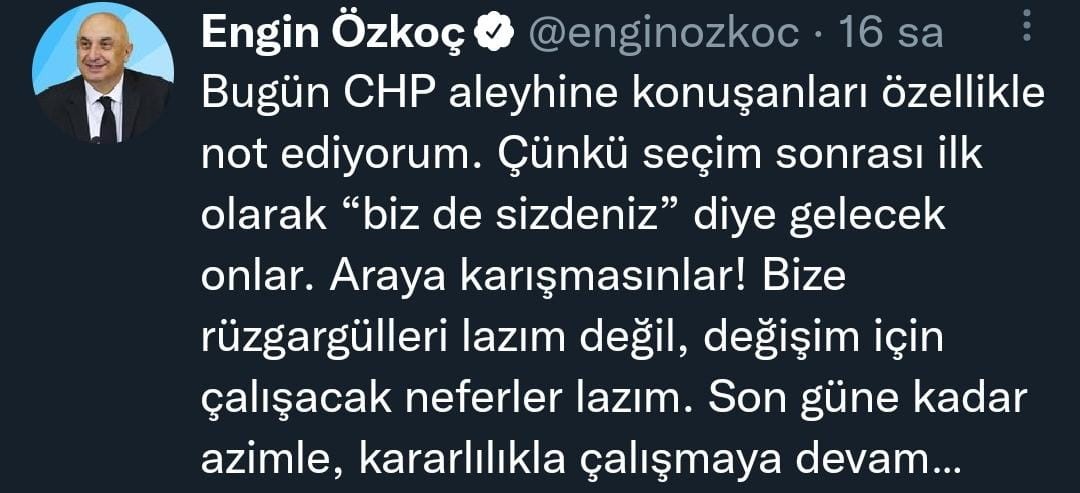 "Bugün CHP aleyhine konuşanları özellikle not ediyorum. Çünkü seçim sonrası ilk olarak “biz de sizdeniz” diye gelecek onlar. Araya karışmasınlar! Bize rüzgargülleri lazım değil, değişim için çalışacak neferler lazım. Son güne kadar azimle, kararlılıkla çalışmaya devam..."