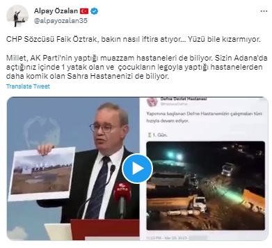 AK Parti Milletvekili Alpay Özalan, Öztrak'a tepki göstererek "CHP Sözcüsü Faik Öztrak, bakın nasıl iftira atıyor... Yüzü bile kızarmıyor. Millet, AK Parti'nin yaptığı muazzam hastaneleri de biliyor. Sizin Adana'da açtığınız içinde 1 yatak olan ve çocukların legoyla yaptığı hastanelerden daha komik olan Sahra Hastanenizi de biliyor" dedi.