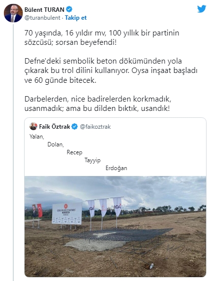 AK Parti Grup Başkanvekili Bülent Turan Öztrak'ın troll dili kullanmasını sert bir dille eleştirerek "70 yaşında, 16 yıldır mv, 100 yıllık bir partinin sözcüsü; sorsan beyefendi! Defne'deki sembolik beton dökümünden yola çıkarak bu trol dilini kullanıyor. Oysa inşaat başladı ve 60 günde bitecek. Darbelerden, nice badirelerden korkmadık, usanmadık; ama bu dilden bıktık, usandık!" dedi.