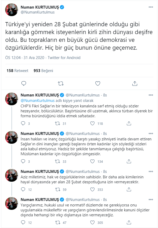 Eski CHP Milletvekili Fikri Sağlar'ın başörtüsüne yönelik ayrımcı ifadeler kullandığı skandal sözlerini eleştiren AK Parti Genel Başkanvekili Numan Kurtulmuş, "İnsan hakları ve inanç özgürlüğü karşıtı yasakçı zihniyeti inatla devam ettiren Sağlar’ın dini inançları gereği başlarını örten kadınlar için söylediği sözleri asla kabul etmiyoruz. Hadsiz bir şekilde tanımlamaya çalıştığı başörtüsü, Müslüman kadınlar için özgürlüğün simgesidir." dedi.