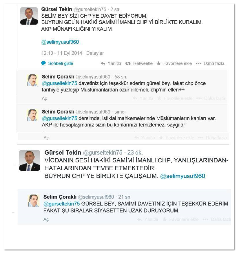 CHP Milletvekili Gürsel Tekin, Twitter'dan eski cemaatçi Selim Çoraklı'yı partiye davet etti. Çoraklı verdiği Tekin'e CHP'nin tairhiyle yüzelşmesini ve Müslüanlar'dan özür dilemesi gerektiğini söyleyerek Dersim'de İstikalal mahkemelerinde Müslümanların kanı olduğunu belirterek CHP'nin bu kanı temizlemeyeceğini söyledi.