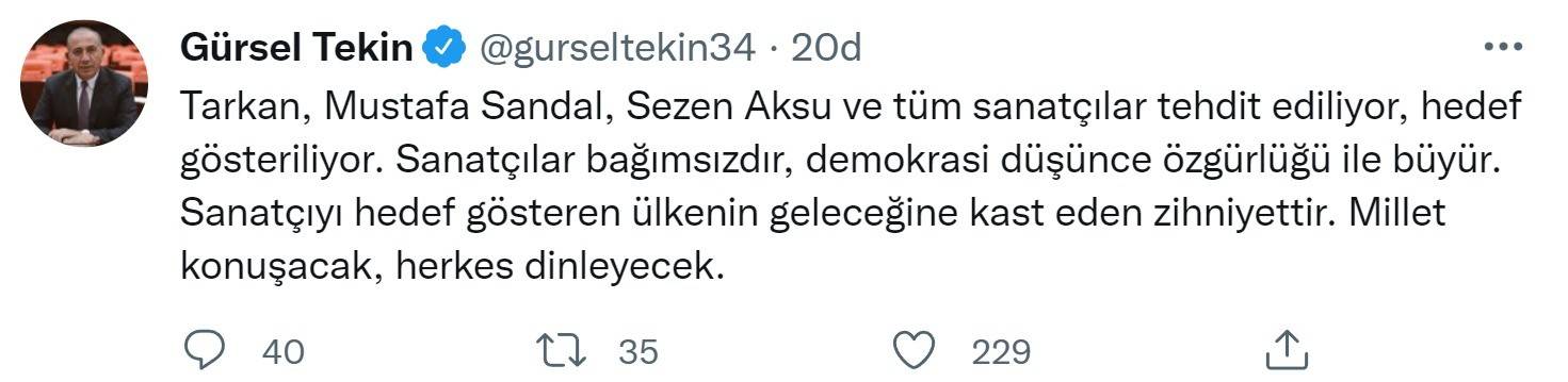 Tarkan, Mustafa Sandal, Sezen Aksu ve tüm sanatçılar tehdit ediliyor, hedef gösteriliyor. Sanatçılar bağımsızdır, demokrasi düşünce özgürlüğü ile büyür. Sanatçıyı hedef gösteren ülkenin geleceğine kast eden zihniyettir. Millet konuşacak, herkes dinleyecek.