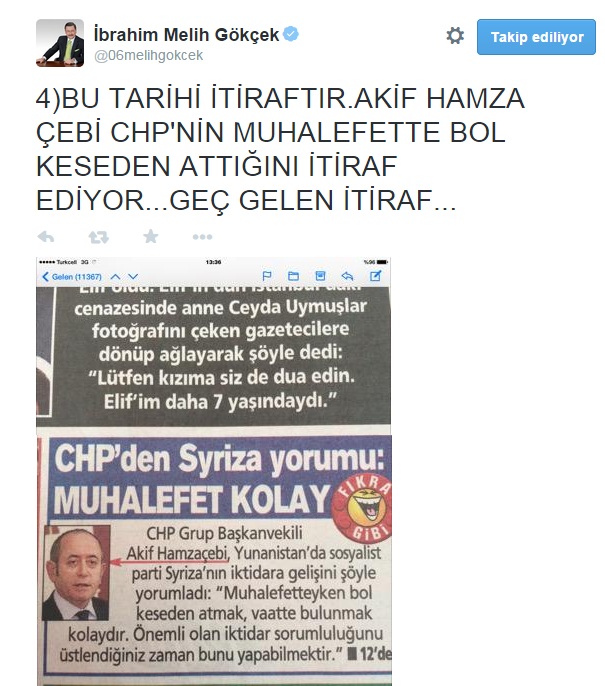 YENİAKİT.COM.TR - Ankara Büyükşehir Belediye Başkanı Melih Gökçek, bugün Twitter hesabından CHP Grup Başkan Vekili Akif Hamzaçebi'nin Syriza ile ilgili yorumunu paylaştı. Hamzaçebi'nin Yunanistan'da sosyalist parti Syriza'nın iktidara gelişini, "Muhalefetteyken bol keseden atmak kolaydır" şeklinde yorumlamasına değinen Gökçek, bu yorumu CHP'nin muhalefetteyken bol keseden salladığının itirafı şeklinde niteledi.