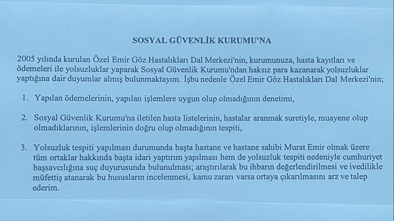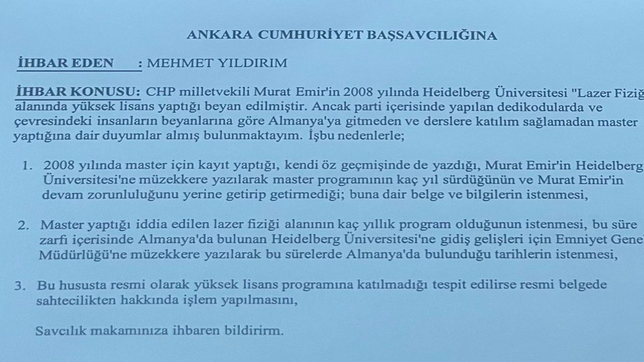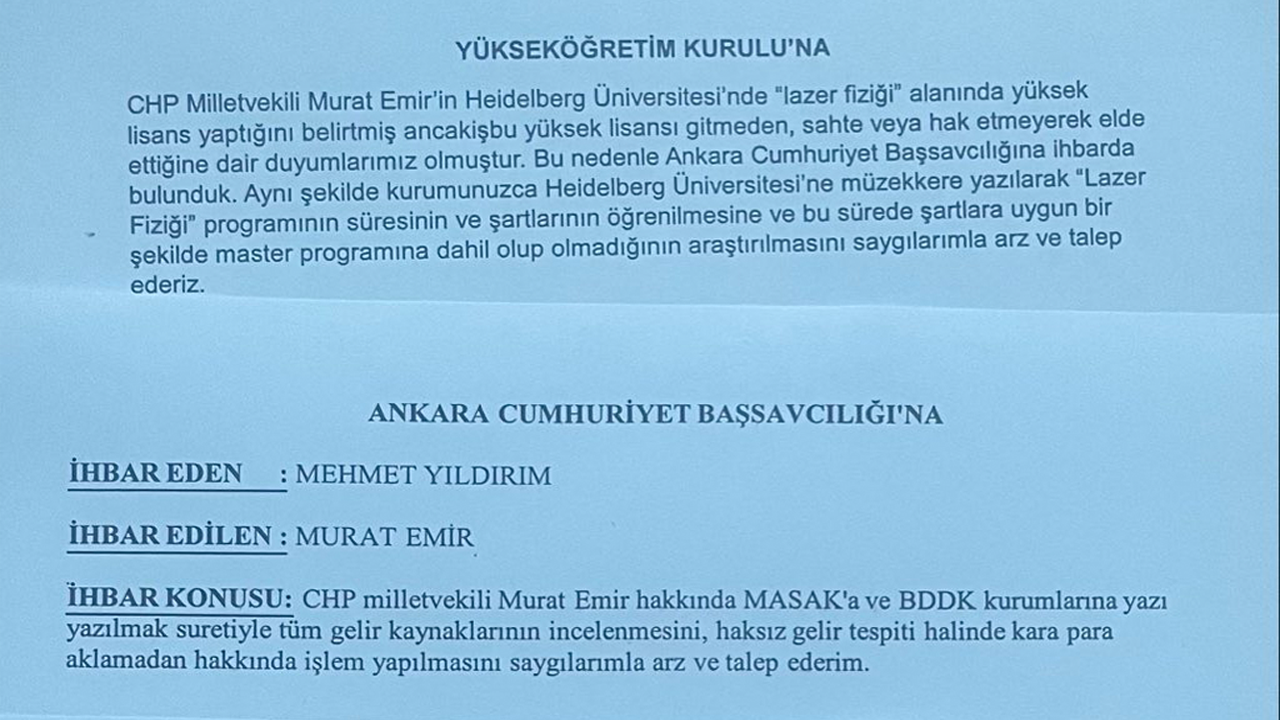 Emir hakkında Yüksek Öğretim Kurulu’na, Ankara Cumhuriyet Başsavcılığı’na ve Sosyal Güvenlik Kurumu’na verdiği şikayet dilekçelerini paylaşan Av. Yıldırım, CHP Başkanvekili’nin yüksek lisansının sahte olduğunu, 2005 yılında kurulan Özel Emir Göz Hastalıkları Dal Merkezi’nin hasta kayıtları ve ödemelerinde usulsüzlük yaparak haksız kazanç elde ettiğini öne sürerek şikayetçi oldu.