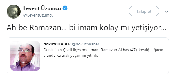 Yine geçtiğimiz dönemde Twitter hesabından bir mesaj paylaşan Levent Üzümcü, Müslümanları gericilikle itham ederek, yüce Kur'an'ın hükümlerini hedef almıştı.