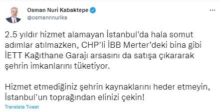CHP'li Ekrem İmamoğlu idaresindeki İBB'nin "İETT garajını satışa çıkarma" kararına tepki gösteren AK Parti İstanbul İl Başkanı Osman Nuri Kabaktepe, "Hizmet etmediğiniz şehrin kaynaklarını heder etmeyin, İstanbul'un toprağından elinizi çekin" dedi.