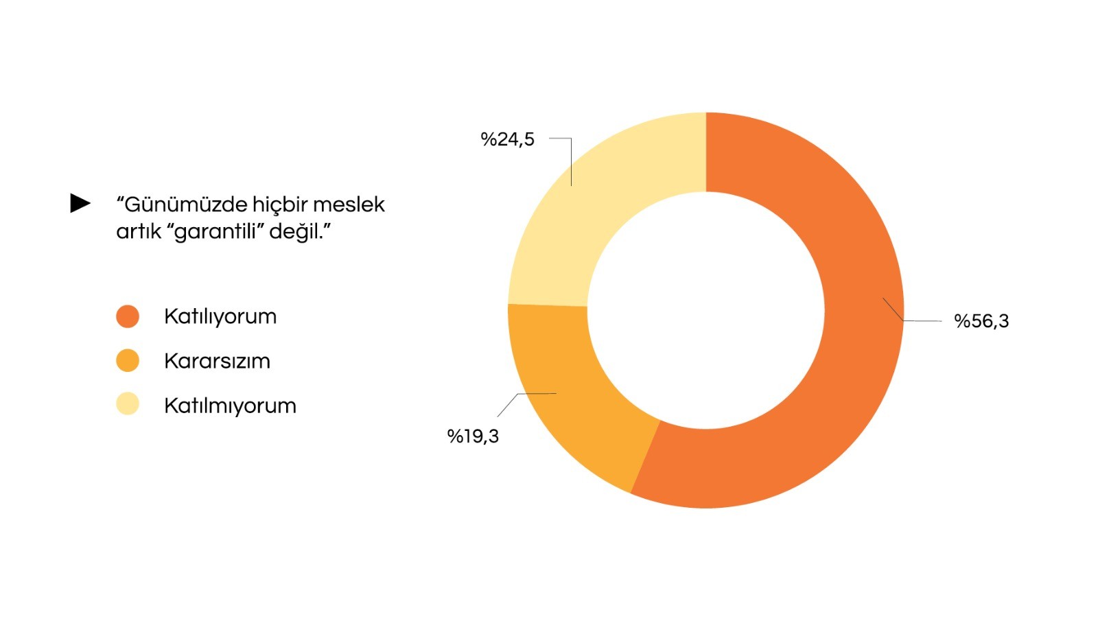 Katılımcıların yüzde 70,2'si kariyer konusunda uzun vadeli plan yapmanın giderek zorlaştığını düşündüğünü ifade etti. Çalışan katılımcılarda bu oran yüzde 66,5, aktif olarak iş arayan katılımcılarda yüzde 79. Katılımcıların yüzde 38,2'si aldığı eğitim ile yaptığı işin hiç örtüşmediğini belirtirken, bu oran saha çalışanlarında yüzde 56,9, ofis çalışanlarında ise yüzde 26,9 oldu.