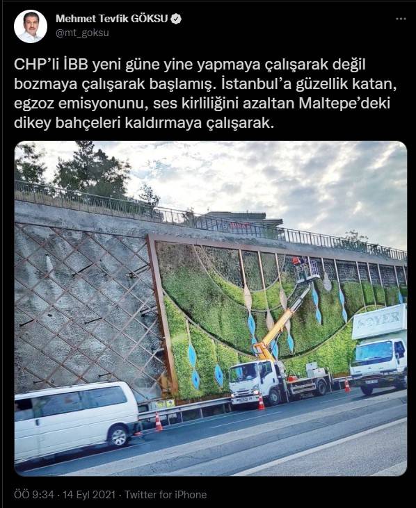 "CHP’li İBB yeni güne yine yapmaya çalışarak değil bozmaya çalışarak başlamış. İstanbul’a güzellik katan, egzoz emisyonunu, ses kirliliğini azaltan Maltepe’deki dikey bahçeleri kaldırmaya çalışarak."