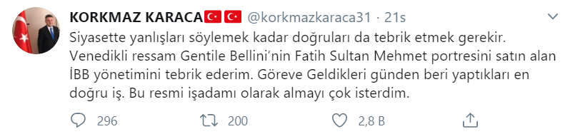 1 yıldır görevde olan fakat bir icraati bulunmayan CHP'li İmamoğlu'nu tebrik ederken dikkat çeken bir göndermede bulunan Karaca, "Siyasette yanlışları söylemek kadar doğruları da tebrik etmek gerekir. Venedikli ressam Gentile Bellini’nin Fatih Sultan Mehmet portresini satın alan İBB yönetimini tebrik ederim. Göreve geldikleri günden beri yaptıkları en doğru iş. Bu resmi işadamı olarak almayı çok isterdim." ifadelerini kullandı.