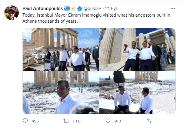 Greek City Times gazetesinin Atina Müdürü Paul Antonopoulos, twitter paylaşımında, "İstanbul Belediye Başkanı Ekrem İmamoğlu bugün atalarının binlerce yıl önce Atina'da inşa ettiği eserleri ziyaret etti." demişti.