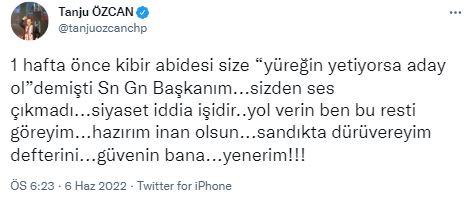 "1 hafta önce kibir abidesi size 'yüreğin yetiyorsa aday ol' demişti Sn Gn Başkanım... Sizden ses çıkmadı... Siyaset iddia işidir... Yol verin ben bu resti göreyim... Hazırım inan olsun... Sandıkta dürüvereyim defterini... Güvenin bana... Yenerim!!!"