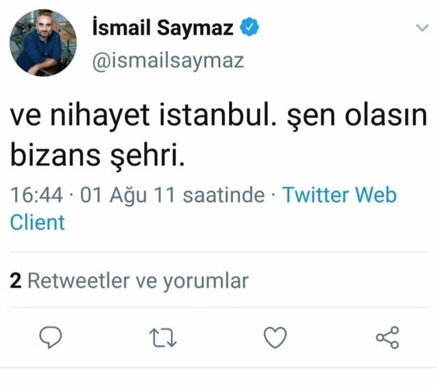 CHP yandaşı İsmail Saymaz’ın İstanbul’u “Bizans şehri” olarak nitelediği paylaşımı yeniden gündeme geldi. Ayasofya’nın ibadete açılmasına da karşı çıkan Saymaz’ın sözleri, “Rum sevici” yorumlarına neden oldu.