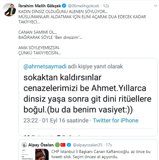Ankara Büyükşehir Belediyesi eski Başkanı İbrahim Melih Gökçek ise Kaftancıoğlu'nun tweeti hakkında şunları söyledi: "Kadın dinsiz olduğunu alenen söylüyor. Müslümanları aldatmak için elini açarak dua edecek kadar takiyyeci. Canan samimi ol. Bağırarak söyle 'Ben dinsizim ama söyleyemezsin çünkü takiyyecisin."