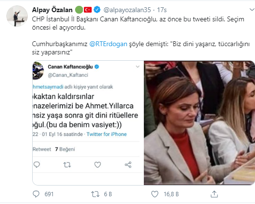AK Parti İzmir Milletvekili Alpay Özalan, ellerini dua eden vaziyette açan Kaftancıoğlu'nun fotoğrafını paylaşarak, "CHP İl Başkanı Canan Kaftancıoğlu az önce bu tweeti sildi. Seçim öncesi el açıyordu. Cumhurbaşkanımız @RTErdoğan şöyle demişti: Biz dini yaşarız, tüccarlığını siz yaparsınız" dedi.