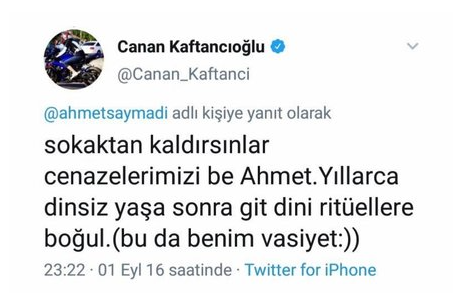 Kaftancıoğlu, İzmir Büyükşehir Belediyesi'nde ihale alan Saymadi'ye sosyal medya hesabından 1 Eylül 2016 tarihinde "Sokaktan kaldırsınlar cenazelerimizi be Ahmet. Yıllarca dinsiz yaşa sonra git dini ritüellere boğul. (bu da benim vasiyet)" dediği ortaya çıktı. CHP'li Kaftancıoğlu'nun bu iletisini ise tweet gündeme gelince sosyal medya hesabından sildiği ortaya çıktı.