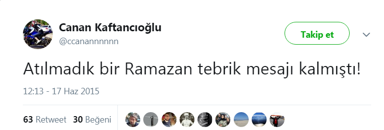 Geçtiğimiz günlerde 'Beylikdüzü İlçe başkanıma, kadın ve gençlik kollarına ve Kadir gecesi iftar sofrasında buluşmamıza vesile olan Belediye başkanımıza sonsuz teşekkürler...' şeklinde bir mesaj paylaşan Kaftancıoğlu'nun 2015 yılında paylaştığı bir twittinde ise Ramazan bayramı hakkında şöyle yazıyor: