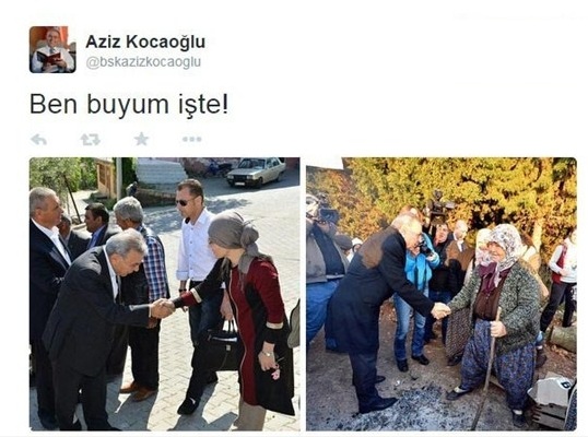 İzmir Büyükşehir Belediye Başkanı CHP’li Aziz Kocaoğlu, kendisini makamında ziyaret eden Başbakan Ahmet Davutoğlu’nu karşılarken çekilen hafif öne eğilmiş fotoğrafının sosyal medyada; özellikle kendi partililerinin tepkisine neden olması üzerine, Twitter hesabından, vatandaşların elini sıkarken de eğildiği fotoğraflarla cevap verdi ve ’Ben buyum işte’ dedi.