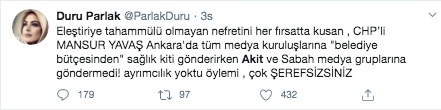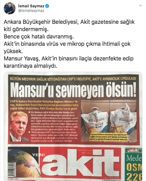 Mansur Yavaş'ın çifte standardına karşılık savunmaya geçen İsmail Saymaz, paylaşımında ''Ankara Büyükşehir Belediyesi, Akit gazetesine sağlık kiti göndermemiş. Bence çok hatalı davranmış. Akit’in binasında virüs ve mikrop çıkma ihtimali çok yüksek. Mansur Yavaş, Akit’in binasını ilaçla dezenfekte edip karantinaya almalıydı.'' ifadelerini kullandı.