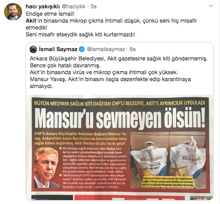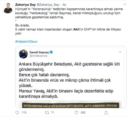 Zekeriya Say ise İsmail Saymaz'a "Hürriyet'in "Koronavirüs" tedbirleri kapsamında karantinaya almak yerine kovduğu "herbokolog" İsmail Saymaz, kendi miktopluğunu unutup tüm cehaletiyle gazetemize saldırmış. Bu arada, 5 vakit namaz kılan insanlardan oluşan Akit'in CHP'nin kitine de ihtiyacı yok! #HaberinOlsun" cevabını verdi.