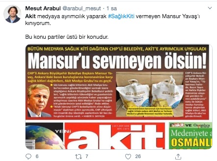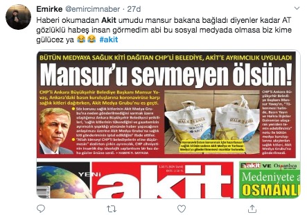 Öte yandan Akit'in ihtiyacı olmadığı, hatta tenezzül bile etmeyeceği sağlık kitleri ile ilgili habere, İsmail Saymaz'ın atlaması şaşırtmadı. CHP'li Mansur Yavaş'ın yandaş uygulamasını faşistçe savunan İsmail Saymaz'ın bu hareketi, "3'üncü şahıs"a düşene talip olmasına bağlandı.
