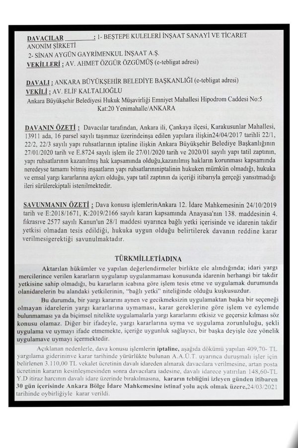 CHP'li Ankara Büyükşehir Belediye Başkanı Mansur Yavaş'ın hukuksuz işlem yaptığı bir kez daha belgelendi. Ankara 17. İdare Mahkemesi; Ankara Büyükşehir Belediyesi'nin, TOGO İkiz Kuleleri'ni mühürlemesi ve ruhsatlarının iptali kararları hukuksuz olduğuna karar verdi.