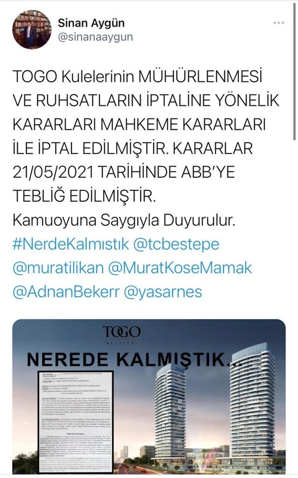 CHP eski Ankara Milletvekili ve Ankara Ticaret Odası Eski Başkanı Sinan Aygün, Ankara 17. İdare Mahkemesi'ne suç duyurusunda bulunmuştu. Suç duyurusunda; Ankara Büyükşehir Belediyesi'nin TOGO İkiz Kuleleri inşaatlarının 16 Aralık 2019 tarihli tutanak ile seviye tespitine ve inşai faaliyetin durdurulmasına ilişkin işlemin hukuka aykırı olduğuna dikkat çekildi.