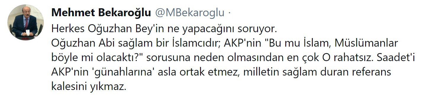 Saadet Partisi’nden istifa ederek kadın kontenjanından CHP’ye geçen Mehmet Bekaroğlu, sosyal medya hesabından yaptığı paylaşımda, “Herkes Oğuzhan Bey'in ne yapacağını soruyor. Oğuzhan Abi sağlam bir İslamcıdır; AKP'nin "Bu mu İslam, Müslümanlar böyle mi olacaktı?" sorusuna neden olmasından en çok O rahatsız. Saadet'i AKP'nin 'günahlarına' asla ortak etmez, milletin sağlam duran referans kalesini yıkmaz.” ifadelerini kullandı.