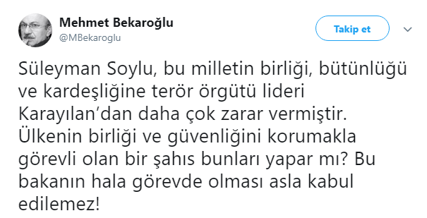 Terörle mücadelede büyük bir kararlılık gösteren İçişleri Bakanı Süleyman Soylu'yu hedef alan CHP'li Mehmet Bekaroğlu, PKK elebaşı Murat Karayılan'ın daha iyi olduğunu yazdı.