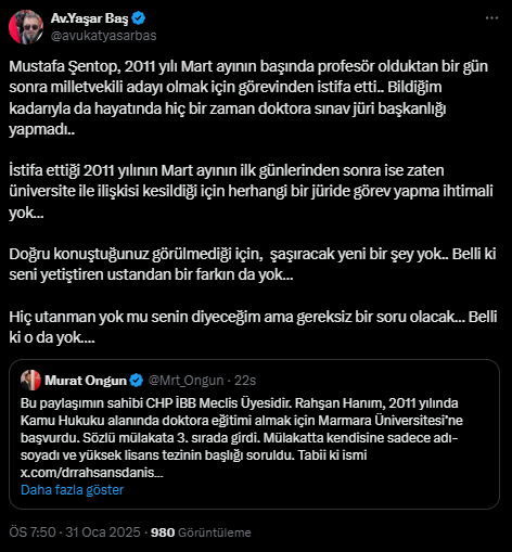 CHP İstanbul Büyükşehir Belediyesi (İBB) Meclis Üyesi Murat Ongun’un, AK Partili eski TBMM Başkanı Mustafa Şentop hakkında yaptığı iddia büyük tepki topladı. Ongun, 2011 yılında akademik mülakatta Rahşan Sertkaya Daniş adlı bir kişinin sadece ismi nedeniyle elendiğini ve jüri başkanının Mustafa Şentop olduğunu öne sürdü. Oysa gerçek başkaydı.