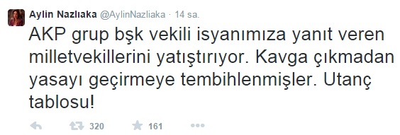 Olayların üzerine CHP Ankara Milletvekili Aylin Nazlıaka günlerdir Meclis'te çıkan kavgaların sırrını deşifre etti. Nazlıka Twitter hesabından, "AK Partililer kavga çıkmadan yasayı geçirmeye tembihlenmiş, utanç tablosu" ifadelerini kullandı.