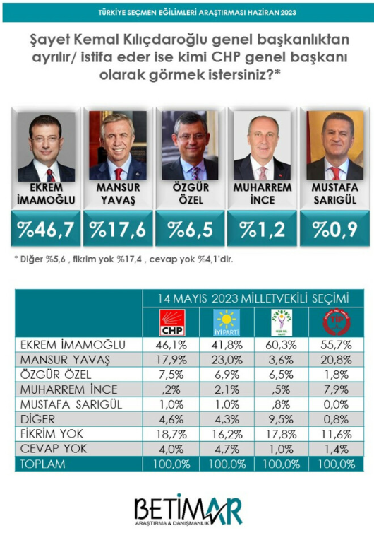 BETİMAR Araştırma, muhalif seçmenlere sordu: "Şayet Kılıçdaroğlu genel başkanlıktan ayrılırsa kimi CHP Genel Başkanı olarak görmek istersiniz"
