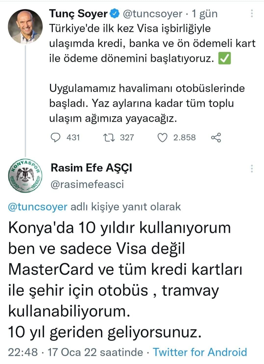 Rasim Efe Aşçı isimli Konyalı bir kullanıcı Tunç Soyer’e, “Konya’da 10 yıldır kullanıyorum ben ve sadece Visa değil Master Card ve tüm kredi kartları ile şehir içi otobüs, tramvay kullanabiliyorum. 10 yıl geriden geliyorsunuz” diye yazdı. Konyalı vatandaşın Soyer’e verdiği cevap adeta sosyal medyada günün kapağı oldu. Diğer kullanıcıların CHP’li Soyer’i tiye alan paylaşımlarıyla adeta sosyal medya yıkıldı.