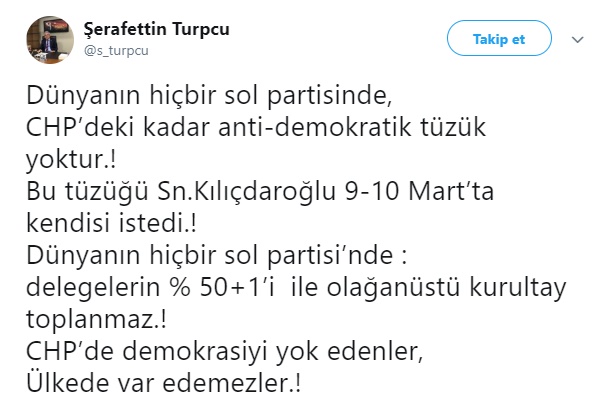 Attığı bir tweette, "Dünyanın hiçbir sol partisinde, CHP’deki kadar anti-demokratik tüzük yoktur.!" çıkışında bulunan Turpcu, dünyanın hiçbir sol partisinde delegelerin yüzde 50+1 oyuyla olağanüstü kurultay toplamayacağını vurguladı.