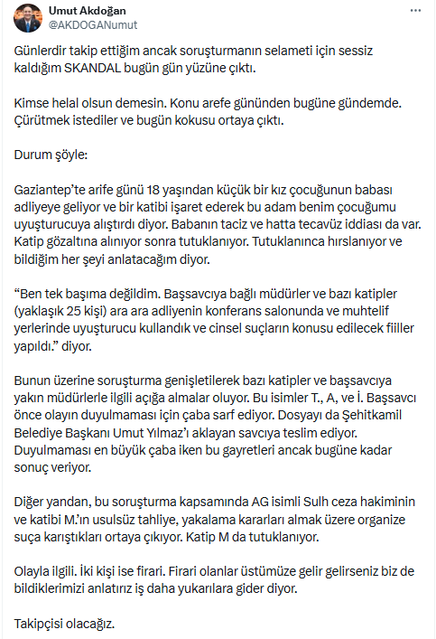 “Konu arefe gününden bugüne gündemde. Çürütmek istediler ve bugün kokusu ortaya çıktı. Durum şöyle: Gaziantep’te arefe günü 18 yaşından küçük bir kız çocuğunun babası adliyeye geliyor ve bir katibi işaret ederek ‘Bu adam benim çocuğumu uyuşturucuya alıştırdı’ diyor. Babanın taciz ve hatta tecavüz iddiası da var. Katip gözaltına alınıyor, sonra tutuklanıyor. Tutuklanınca hırslanıyor ve ‘Bildiğim her şeyi anlatacağım’ diyor.”