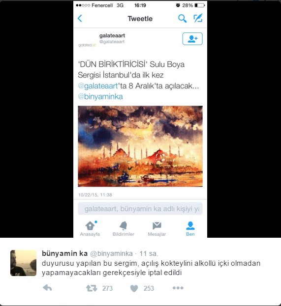 Bünyamin K., resim sergisinin, CHP üyesi Ali Şahinler'in sahibi olduğu sanat galerisi tarafından, "açılış kokteylini alkollü içki olmadan yapamayacakları" gerekçesiyle iptal edildiğini duyurdu.