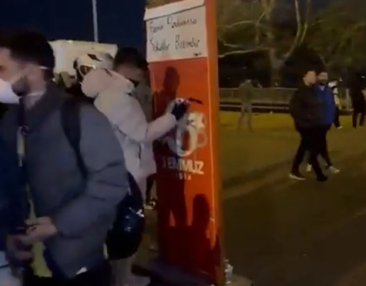Ekrem İmamoğlu’nun gözaltına alınmasının ardından Saraçhane’de toplanan bir grup eylemci, 15 Temmuz şehitlerinin bulunduğu panodaki fotoğraflara sprey boya sıkarak, "Genel grev, genel isyan" yazdı.