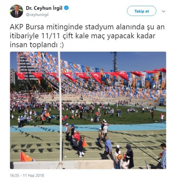 Mitingin yapılacağı alanın fotoğrafını paylaşan İrgil, “AK Parti Bursa mitinginde stadyum alanında şu an itibariyle 11/11 çift kale maç yapacak kadar insan toplandı :)” ifadelerini kullandı.