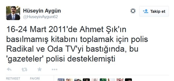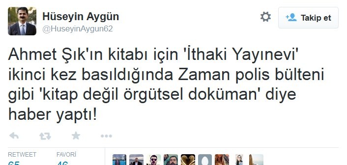 CHP'li Aygün, "16-24 Mart 2011'de Ahmet Şık'ın basılmamış kitabını toplamak için polis Radikal ve Oda TV'yi bastığında, bu 'gazeteler' polisi desteklemişti. Ahmet Şık'ın kitabı için 'İthaki Yayınevi' ikinci kez basıldığında Zaman polis bülteni gibi 'kitap değil örgütsel doküman' diye haber yaptı!" mesajlarını paylaştı.