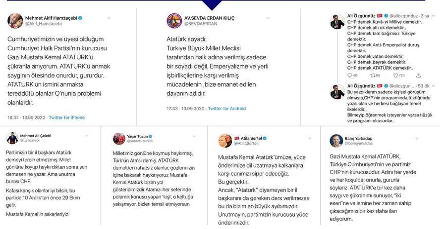 Cumhuriyet Halk Partisi (CHP) İstanbul İl Başkanı Canan Kaftancıoğlu'nun 'Atatürk' ifadesine çok sayıda CHP'li büyük bir tepki gösterdi. Tepki gösteren Atatürkçü ve CHP'lilerin büyük bir çoğunluğu nedense Canan Kaftancıoğlu'nun adını bile anmadı. Sosyal medya hesabından açıklamalarda bulunan CHP yandaşları ve CHP'liler Kaftancoğlu'na hiç bulaşmadan Atatürk'le ilgili mesajlar yayınladılar.