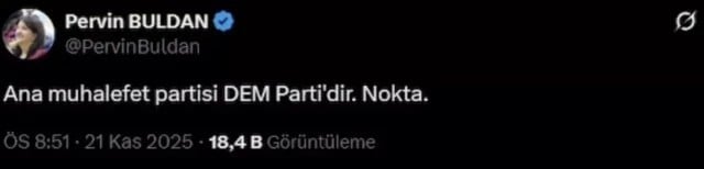 Öte yandan İmralı heyetinde yer alan DEM Partili Pervin Buldan ise bir paylaşım yaptı. Buldan, X hesabından "Ana muhalefet partisi DEM Parti'dir. Nokta." ifadelerini kullandı.