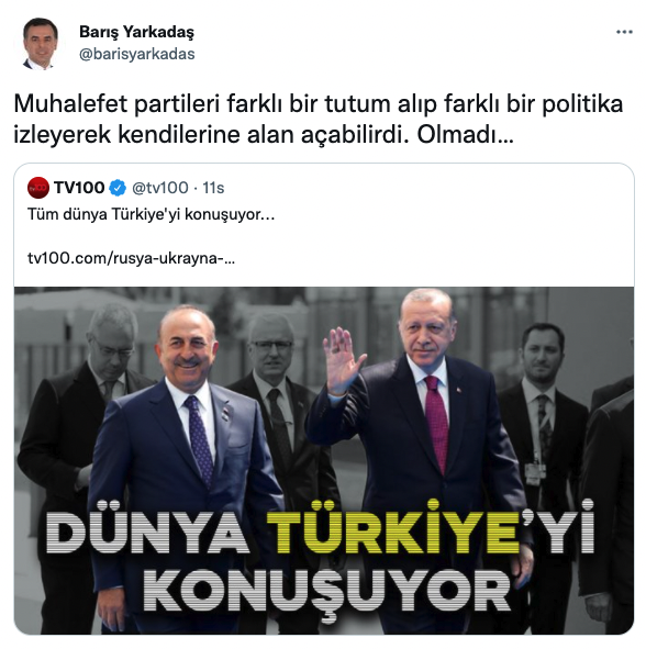 Gazeteci Barış Yarkadaş, Rusya-Ukrayna savaşında Türkiye’nin rolünü değerlendirirken muhalefet partilerine eleştiride bulundu.
