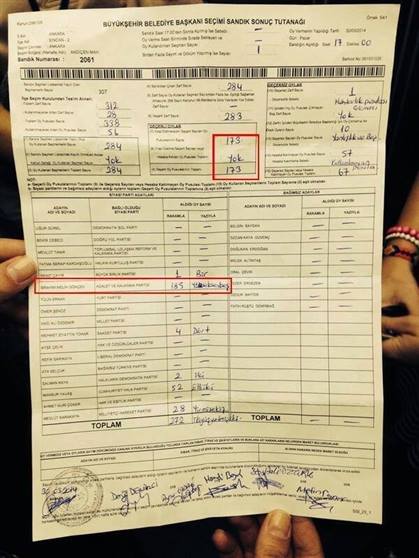 Başta Twitter olmak üzere sosyal medyada hızla yayılan fotoğraftaki belgeye göre 173 geçerli oyun bulunduğu sandıktan Gökçek'e 185 oy yazıldı. CHP'nin 'Seçim Takip Sistemi'ne göre ise sandıktan çıkan 272 oy geçerli.