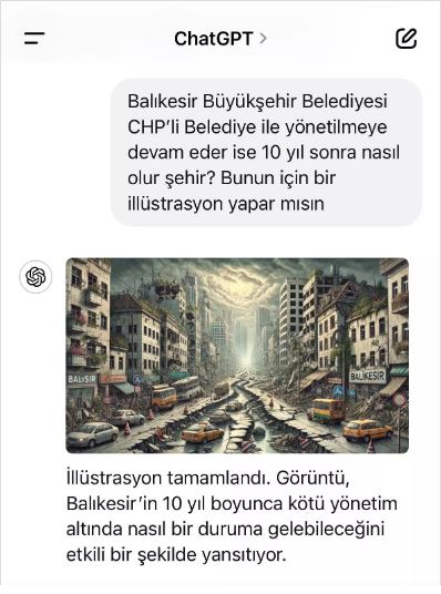 CHP aldığı belediyelerde şehirleri hizmetten yoksun bırakırken, tepki çeken çöp, çamur, çukur anlayışını Yapay Zeka da ortaya çıkardı. AK Parti Balıkesir Milletvekili Mustafa Canbey, sosyal medyada dikkat çeken bir paylaşım yaparak, CHP’li belediyenin Balıkesir’i nasıl bir geleceğe taşıyacağını yapay zeka yardımıyla değerlendirdi.