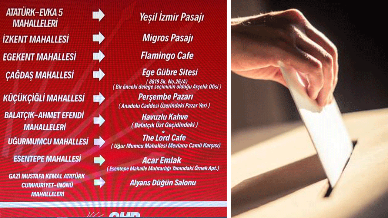 İzmir Çiğli ilçesi CHP örgütü Mansur Yavaş’ın bile boykot ettiği ve İmamoğlu’nun tek aday olarak yarışacağı düzmece ön seçimde, Atatürk ve EVKA 5 mahalleleri, Yeşil İzmir Pasajı'nda; İzkent Mahallesi, Migros Pasajı'nda; Egekent Mahallesi, Flamingo Kafe'de; Çağdaş Mahallesi, Ege Gübre Sitesi'nde (beyaz eşya ofisi); Küçükçiğli Mahallesi, Perşembe Pazarı'nda; Balatçık ve Ahmet Efendi Mahalleleri, Havuzlu Kahve'de; Uğur Mumcu Mahallesi, The Lord Kafe'de; Esentepe Mahallesi, Acar Emlak Ofisi'nde; Yakakent Mahallesi, Kadıköy Kafe'de; Güzeltepe Mahallesi, Yeni Yıldırım Kahvesi'nde; Maltepe Mahallesi, Eski Göztepe Kıraathanesi'nde; Sasalı ve Kaklıç Mahalleleri, Apo'nun Kahvesi'nde sandık kuracak.