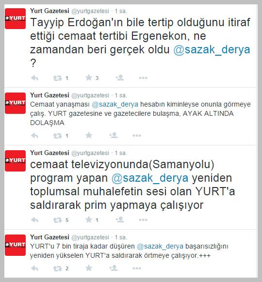 "Toplumcu, muhalif, sol bir halk gazetesi olarak kurulan YURT'u yandaş ve cemat yanlısı hale getirmeye çalışan @sazak_derya YURT'a çamur atmaya devam ediyor. YURT'u 7 bin tiraja kadar düşüren @sazak_derya başarısızlığını yeniden yükselen YURT'a saldırarak örtmeye çalışıyor. Cemaat televizyonunda(Samanyolu) program yapan @sazak_derya yeniden toplumsal muhalefetin sesi olan YURT'a saldırarak prim yapmaya çalışıyor. Cemaat yanaşması @sazak_derya hesabın kiminleyse onunla görmeye çalış. YURT gazetesine ve gazetecilere bulaşma, AYAK ALTINDA DOLAŞMA. Tayyip Erdoğan'ın bile tertip olduğunu itiraf ettiği cemaat tertibi Ergenekon, ne zamandan beri gerçek oldu @sazak_derya ?"