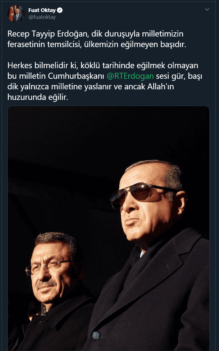 Cumhurbaşkanı yardımcısı Fuat Oktay, "Recep Tayyip Erdoğan, dik duruşuyla milletimizin ferasetinin temsilcisi, ülkemizin eğilmeyen başıdır" dedi.