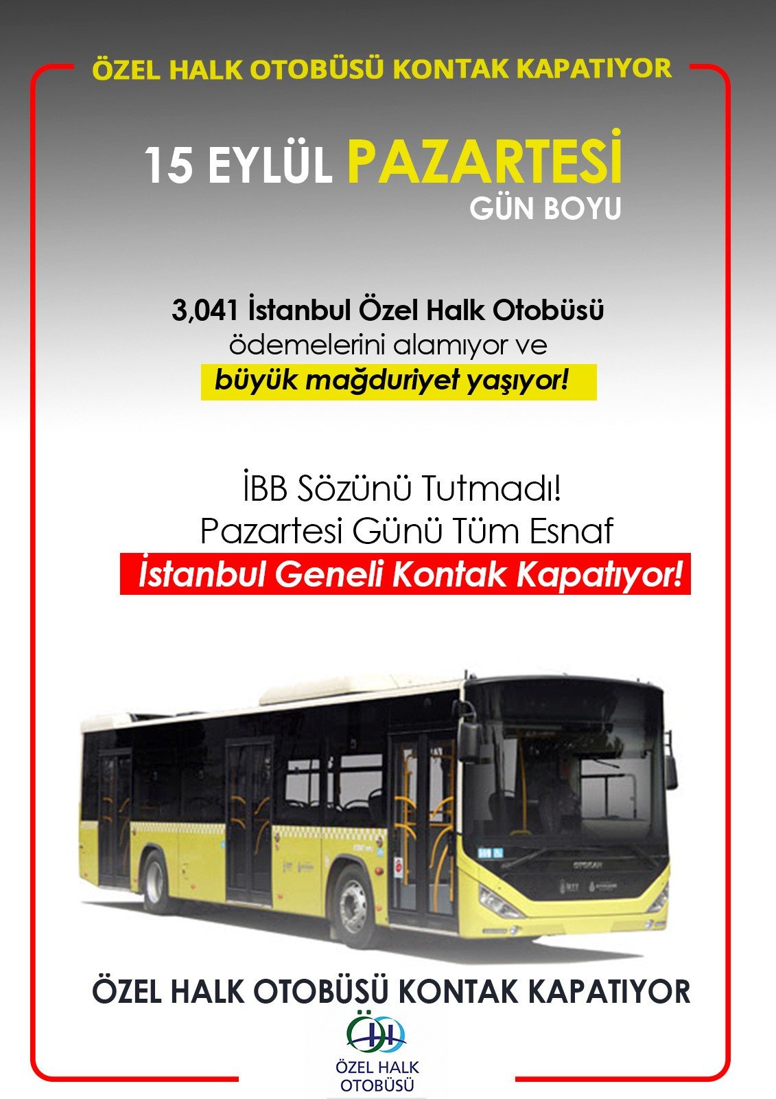 Özel Halk Otobüsü işletmecileri, uzun süredir CHP’li İstanbul Büyükşehir Belediyesi’nden (İBB) alacaklarını tahsil edemediklerini belirterek büyük mağduriyet yaşadıklarını açıkladı. Yapılan duyuruda, “İBB sözünü tutmadı. Pazartesi günü tüm esnaf İstanbul genelinde kontak kapatıyor” denildi.